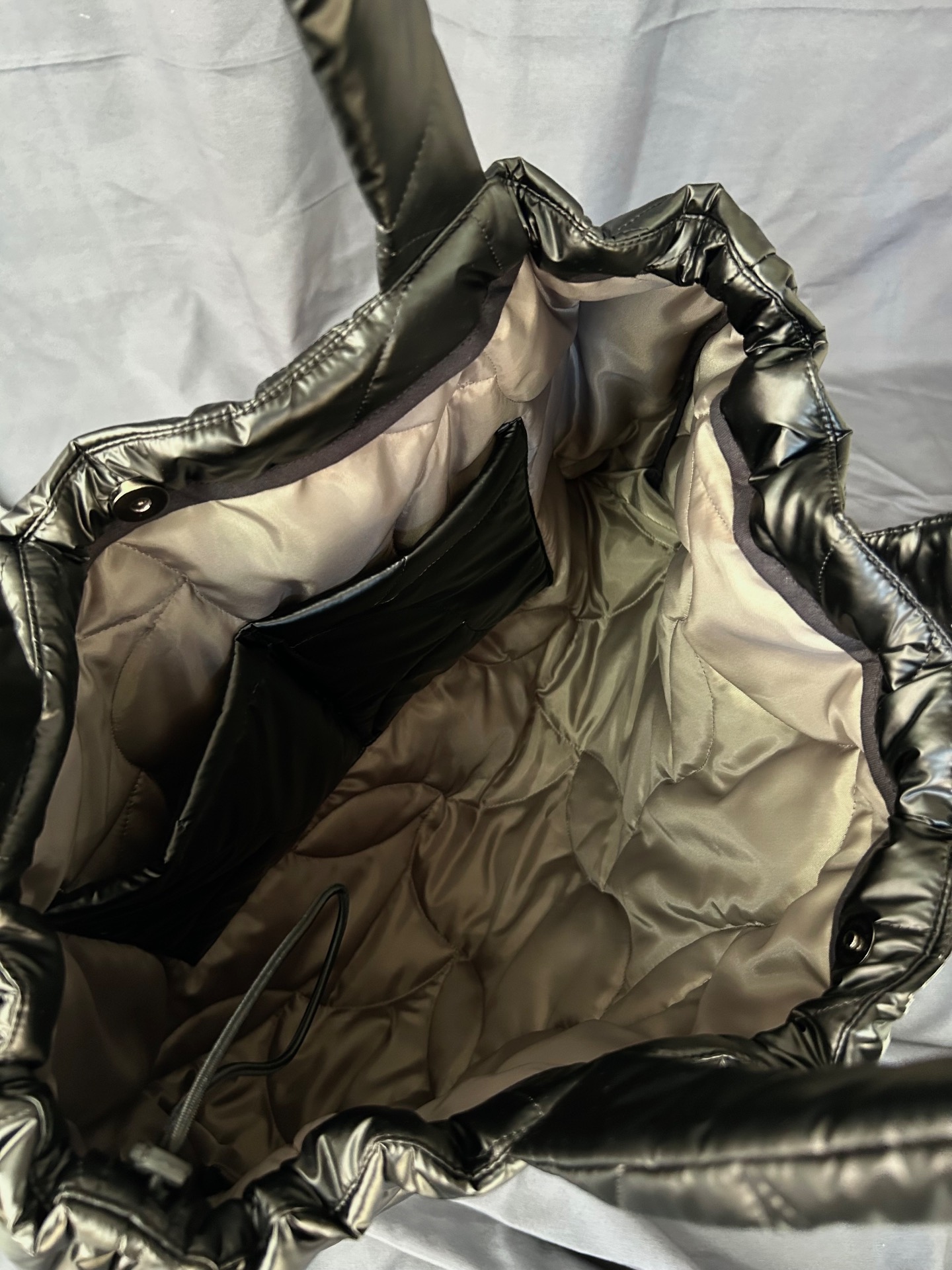 Horní část lze stáhnout pomocí vnitřní gumičky a zapnout cvočkem, takže si sama určíte, jak otevřená nebo uzavřená taška bude.