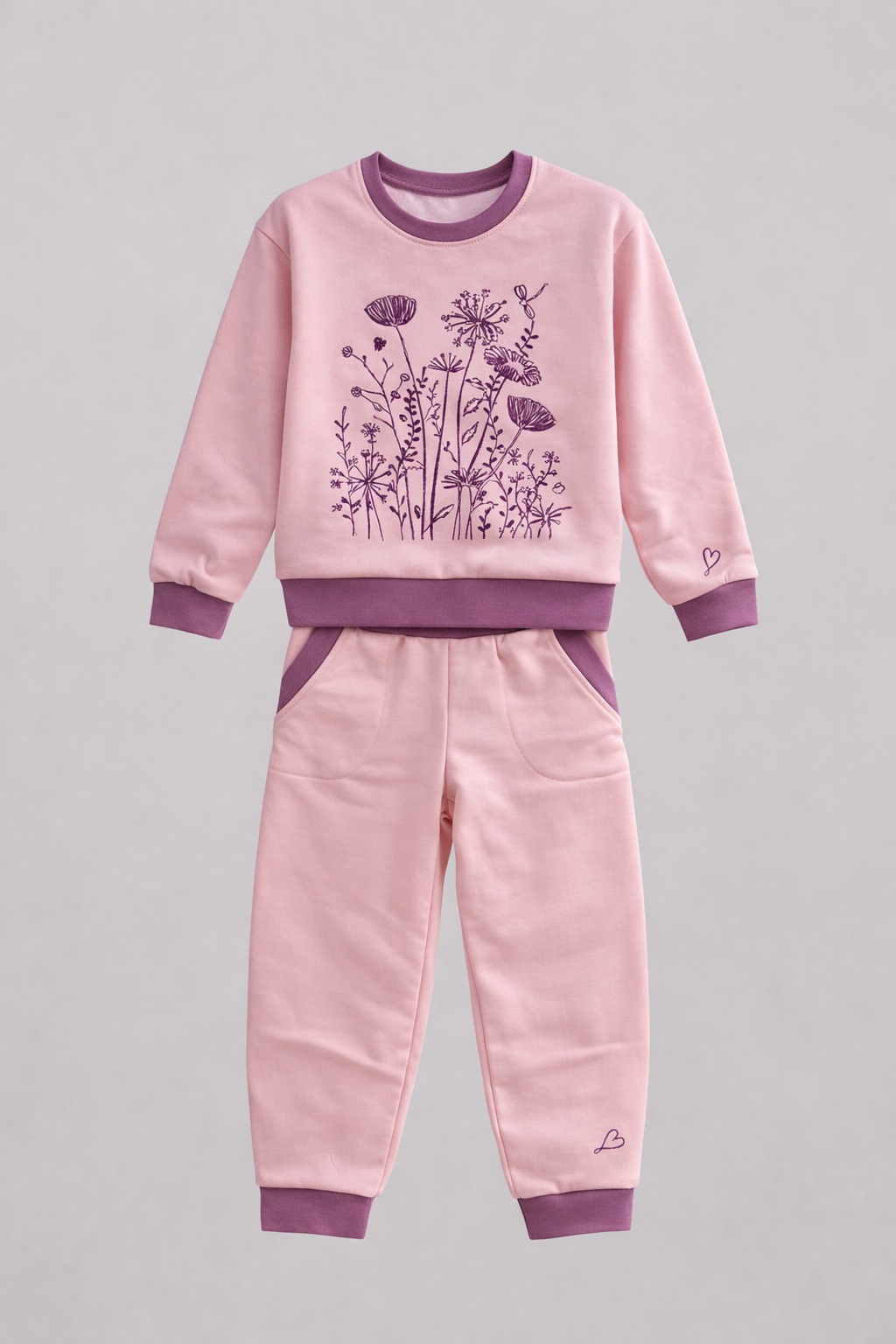 Teplákovka v něžném odstínu, doplněná o lemy ze stejného materiálu jako samotný set, které celý set krásně propojují. Tmavší tón lemů jemnost lehce "rozbije". Nohavice lehce zúžené, aby dobře seděly a nebránily pohybu. Celý kousek doplňuje naše výšivka Květa - tichý detail, který dělá celý set výjimečný.